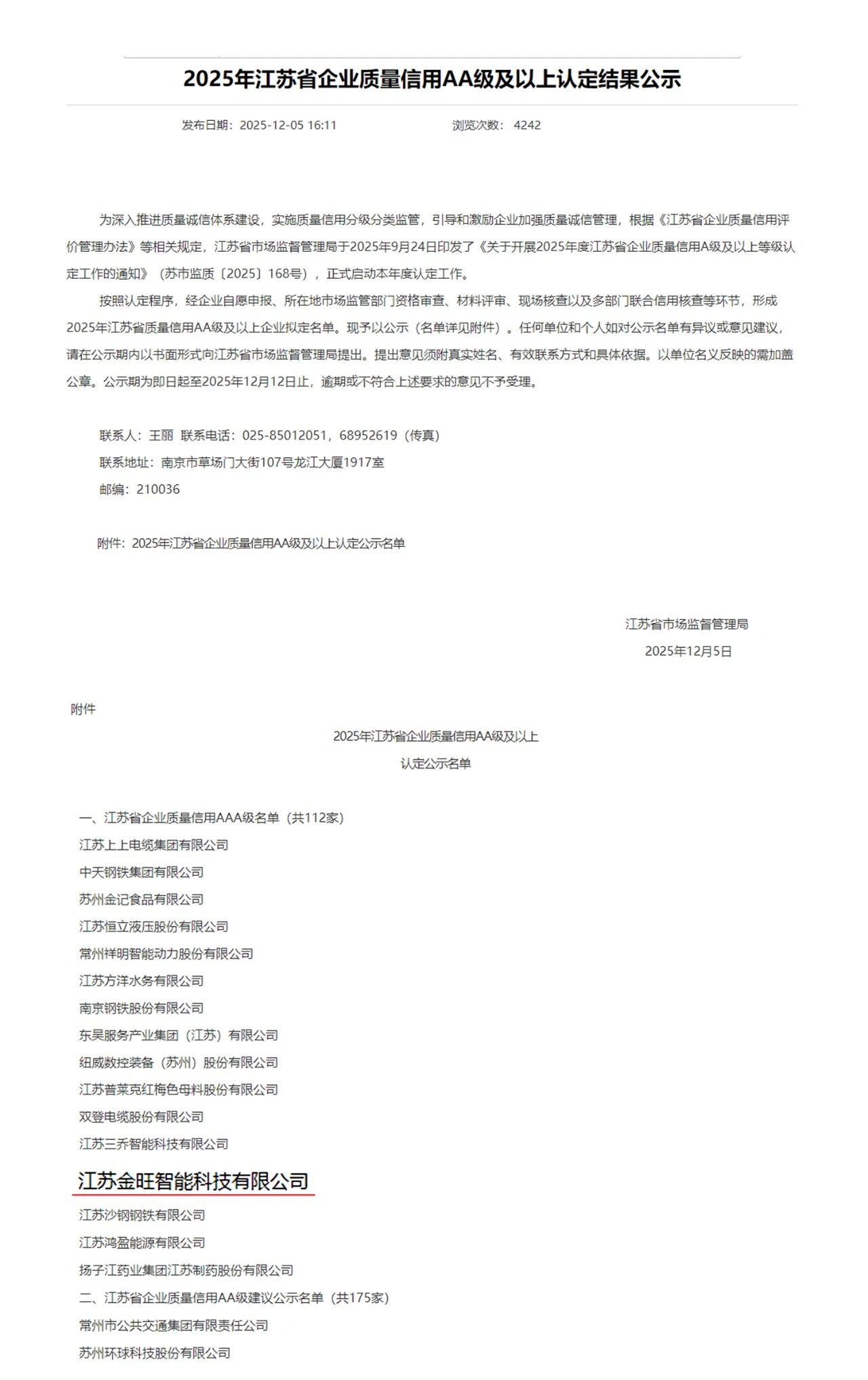 近日,江蘇省市場監督管理局正式公示2025年度江蘇省企業質量信用AA級及以上等級認定名單,金旺智能憑借卓越的質量誠信管理和持續的產品品質提升,成功入選江蘇質量信用AAA級企業。