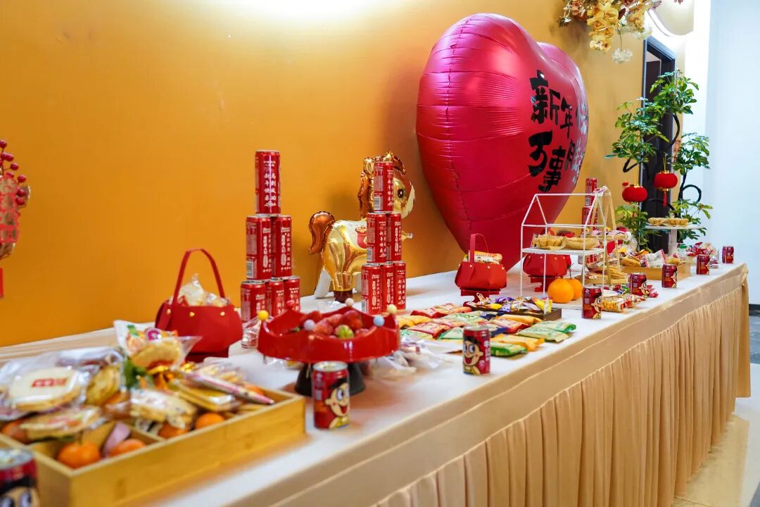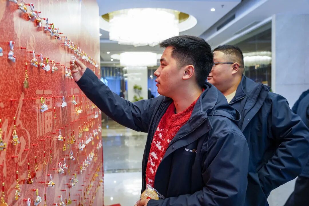 晚會伊始,宴會廳外的“小馬簽到墻”前熱鬧非凡,員工們寫下新春祝福,將550只小馬掛件匯成“萬馬奔騰”之景。馬年主題茶歇臺擺滿年貨,濃郁年味瞬間點燃全場期待。