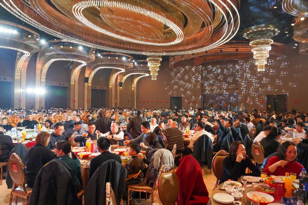 18時30分,大屏燈光秀拉開晚會序幕。主持人金焱、周浩然登臺致新春問候,大屏幕隨即播放一級總監(jiān)及房董的拜年視頻。后臺支持中心總監(jiān)厲鍵上臺祝酒,致敬全體奮斗者,晚宴正式開啟。