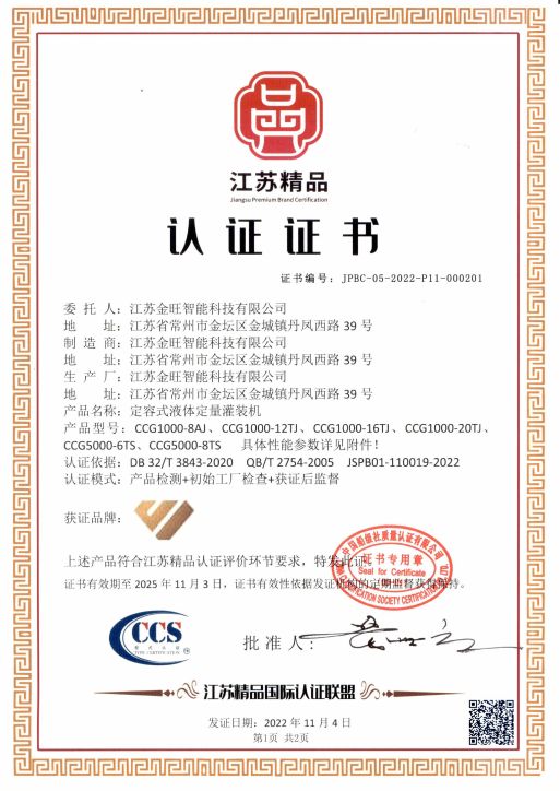日前,從“江蘇精品”國際認證聯盟傳來喜訊,金旺智能科技有限公司憑借自主研發生產的“定容式液體灌裝機”產品榮獲“江蘇精品”認證,這是該系列產品獲得的又一項重量級榮譽。