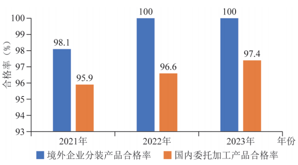 委托加工,是指由委托方提供原料和主要材料(或由受托生產單位自行采購原料),受托方按照委托方要求加工貨物并收取加工費的市場行為。《農藥管理條例》(簡稱《條例》)修訂前禁止農藥委托加工(可以分裝)。為推動農藥產業資源共享,促進產業發展向大向強,2017年新修訂《條例》設立農藥委托加工與分裝規定,委托方人只要取得農藥登記證,就可以委托加工相應的農藥,鼓勵新農藥創制研發、盡快轉化成生產力;受托方人需要取得相應的農藥生產許可證即可。農藥委托加工相關規定對農藥生產集約化、專業化,推動生產企業兼并重組起到了促進作用。通過6年多的實施,基本上達到了該項制度的立法目的,但有部分企業借委托加工與分裝之名,從事轉讓、出租、出借農藥登記證活動,擾亂了農藥市場秩序,亟待按照立法本意予以規范。根據《農業農村部辦公廳關于2021年農藥監督抽查結果的通報》公布的數據,2021年抽查境外企業分裝產品54個,合格53個,不合格1個(系假冒農藥登記證號),合格率98.1%;抽查國內委托加工產品1,147個,合格1,100個,合格率95.9%,國內委托加工產品合格率比境外企業分裝產品合格率低了2.2個百分點,在不合格的47個國內委托加工產品中,有26個產品被標稱企業確認為假冒產品。《農業農村部辦公廳關于2022年農藥監督抽查結果的通報》公布的數據顯示,2022年抽查境外企業分裝產品31個,合格31個,合格率100%;抽查國內委托加工產品1,030個,合格995個,合格率96.6%;國內委托加工產品合格率比境外分裝產品合格率低3.4個百分點。根據《農業農村部辦公廳關于2023年農藥監督抽查結果的通報》公布的數據,2023年抽查境外企業分裝產品34個,合格34個,合格率100%;抽查國內委托加工產品908個,合格884個,合格率97.4%;國內委托加工產品合格率比境外企業分裝產品合格率低了2.6個百分點(圖1)。