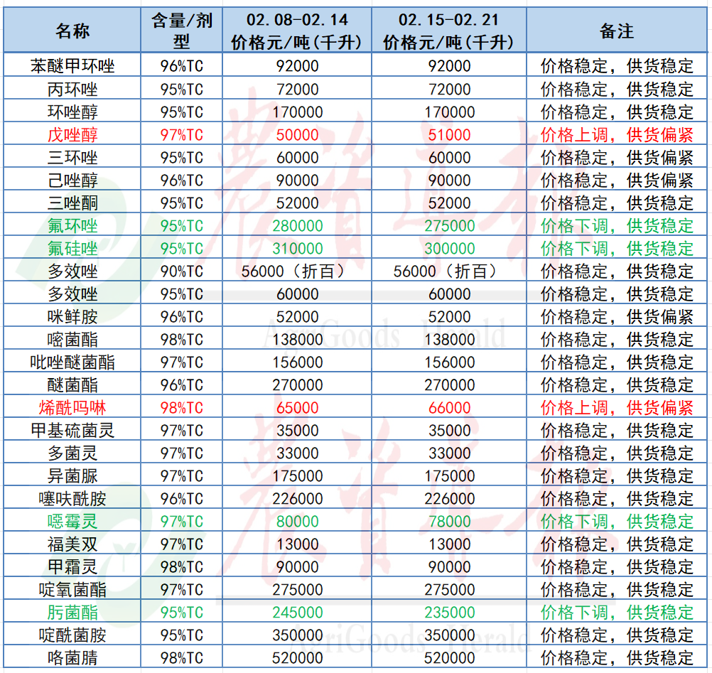 95%氟環唑原藥價格下跌5,000元,至275,000元/噸;95%氟硅唑原藥下跌10,000元,至300,000元/噸;97%噁霉靈原藥下跌2,000元,至78,000元/噸;95%肟菌酯原藥下跌10,000元,至235,000元/噸。