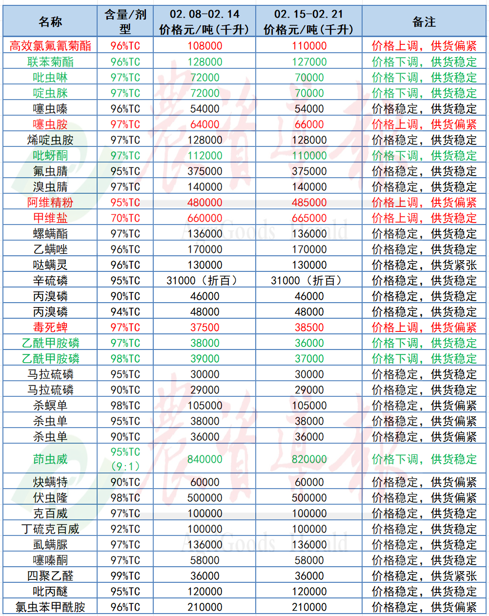 96%高效氯氟氰菊酯原藥價格上漲2,000元,至110,000元/噸;97%噻蟲胺原藥上漲2,000元,至66,000元/噸;95%阿維菌素精粉原藥上漲5,000元,至485,000元/噸;70%甲維鹽(甲氨基阿維菌素苯甲酸鹽)原藥上漲5,000元,至665,000元/噸;97%毒死蜱原藥上漲1,000元,至38,500元/噸。