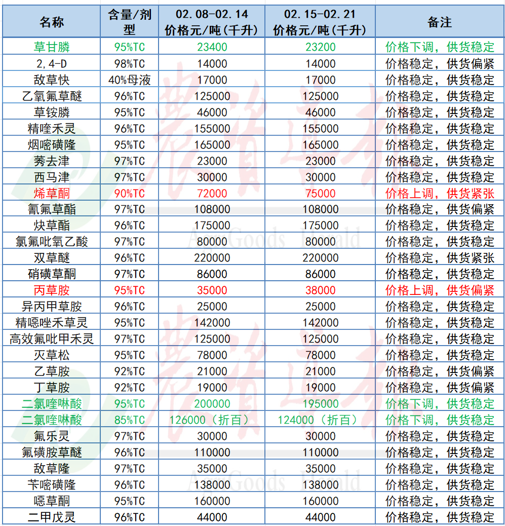 95%草甘膦原藥價格下跌200元,至23,200元/噸;95%二氯喹啉酸原藥下跌5,000元,至195,000元/噸;85%二氯喹啉酸原藥下跌2,000元,至124,000元/噸。