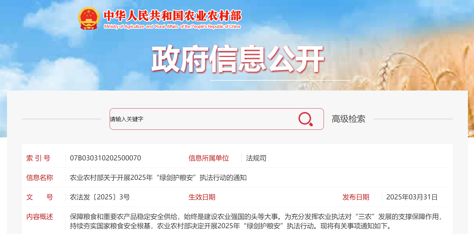 農業農村部關于開展2025年“綠劍護糧安”執法行動的通知