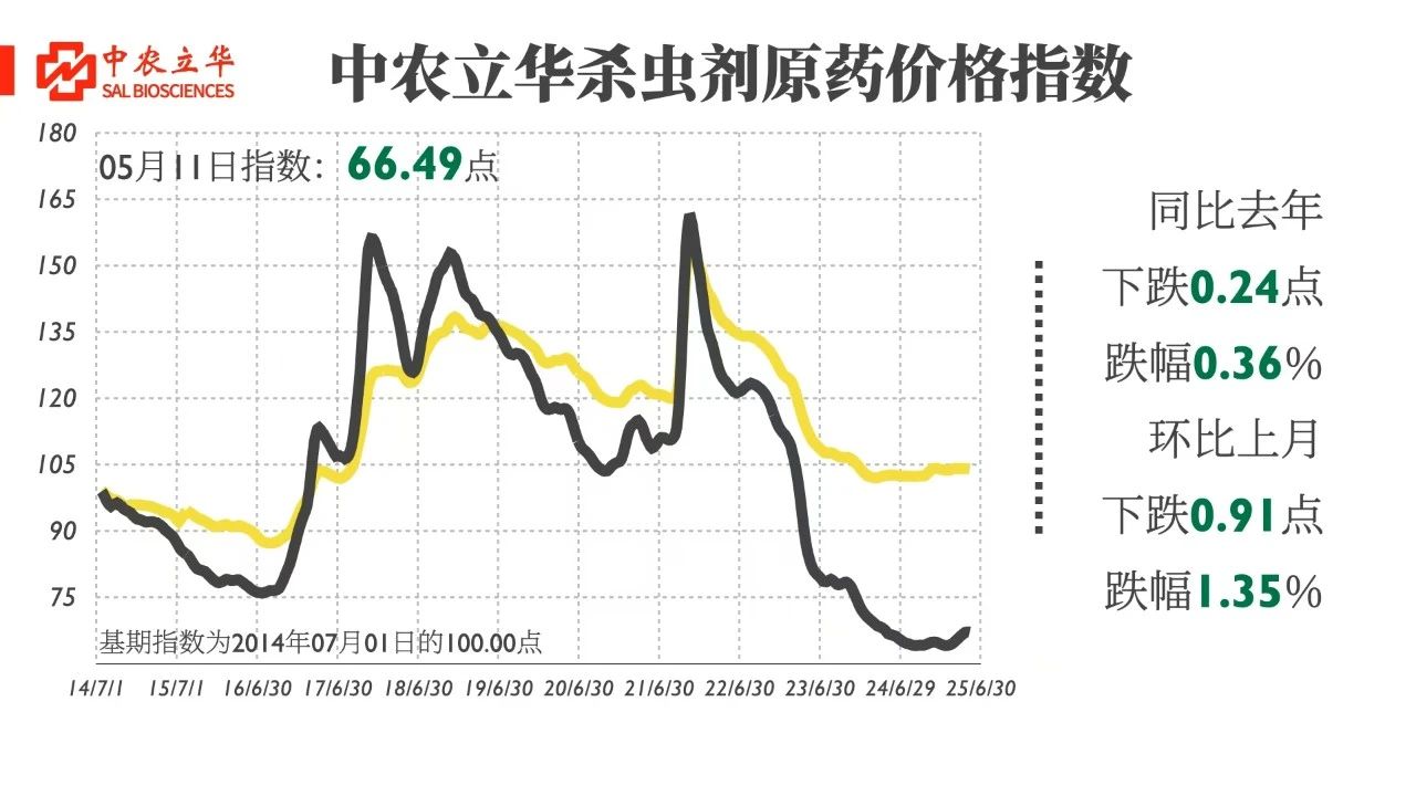2025年5月11日,中農(nóng)立華殺蟲劑原藥價格指數(shù)報66.49點,同比去年下跌0.36%,環(huán)比上月下跌1.35%。