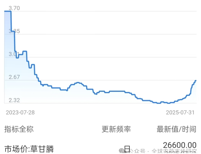 草甘膦需求中70%依賴出口(巴西、阿根廷、美國為主),30%為國內(nèi)農(nóng)業(yè)用藥。此輪需求爆發(fā)來自兩大市場同步拉動(dòng):