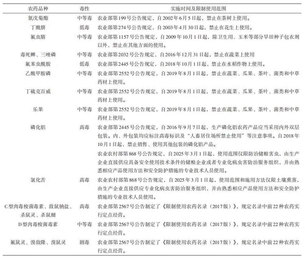 法律規制上,1997年,國務院頒布《農藥管理條例》,明確規定劇毒、高毒農藥不得用于防治衛生害蟲,不得用于蔬菜、瓜果、茶葉和中草藥材,使禁限用農藥管理工作步入了規范化、法制化的軌道。該條例經過2017年、2022年2次修訂,對禁限用農藥的生產、使用等做了更為全面的規定和指導。此外,2021年修訂的《中華人民共和國食品安全法》和2022年修訂的《中華人民共和國農產品質量安全法》有關條款,對禁限用農藥等農用投入品的使用做出嚴格的規定,包括嚴格執行農業投入品使用安全間隔期或者休藥期的規定,禁止將劇毒、高毒農藥用于蔬菜、瓜果、茶葉和中草藥材等國家規定的農作物,禁止在農產品生產經營過程中使用國家禁止使用的農業投入品以及其他有毒有害物質等相關內容。