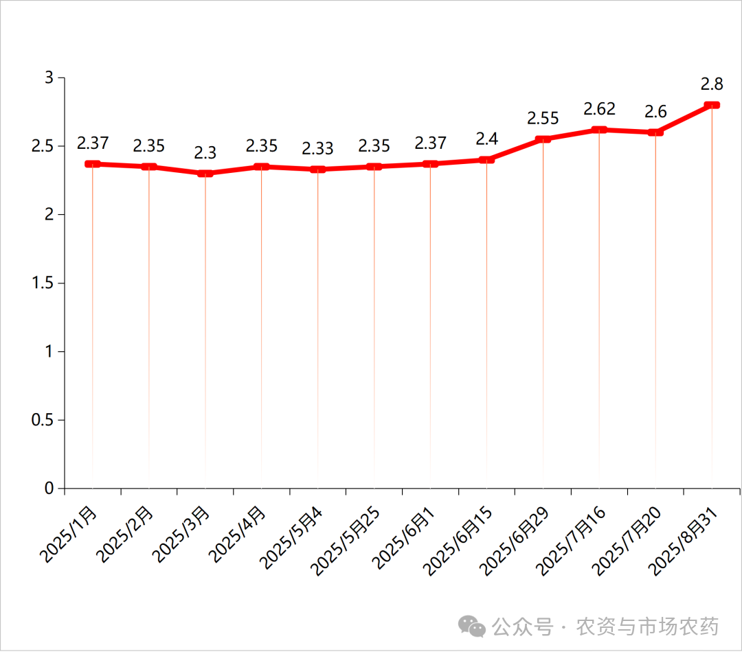 圖1  截至2025年8月31日國內草甘膦原藥價格走勢(單位:萬元/噸)