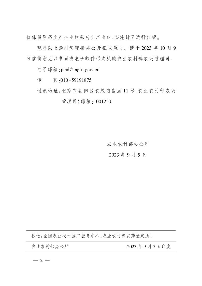 現對以上禁用管理措施公開征求意見。請于2023年10月9日前將意見以書面或電子郵件形式反饋農業農村部農藥管理司。