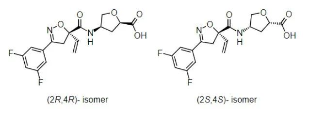 Icafolin的IUPAC名稱:(2RS,4RS)-4-({[(5S)-3-(3,5-二氟苯基)-5-乙烯基-4,5-二氫異噁唑-5-基]羰基}氨基)四氫呋喃-2-甲酸,含有40%~70%的(2R,4R)-異構體和60%~30%的(2S,4S)-異構體;CAS登錄號:2254752-27-5;分子式:C17H16F2N2O5。