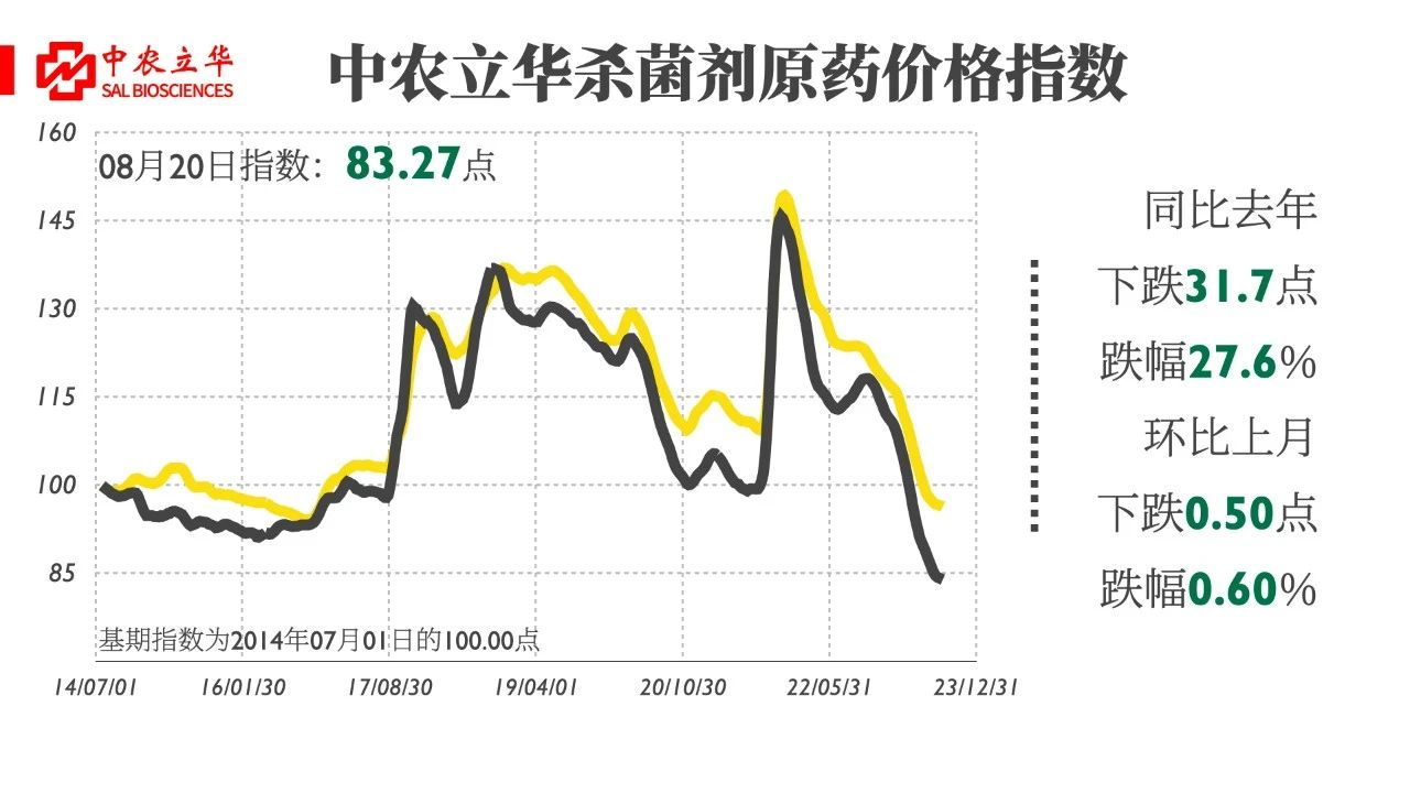 2023年8月20日,中農(nóng)立華殺菌劑原藥價(jià)格指數(shù)報(bào)83.27點(diǎn),同比去年大跌27.6%,環(huán)比上月跌幅0.60%。殺菌劑市場(chǎng)維持弱勢(shì)運(yùn)行態(tài)勢(shì),需求穩(wěn)定釋放,部分品種廠家開工率降低,原材料價(jià)格有所上行,市場(chǎng)關(guān)注度及補(bǔ)貨意愿強(qiáng)。