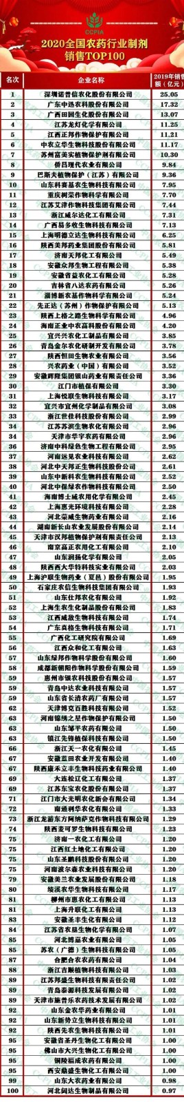 2020全國農藥行業制劑銷售TOP100揭曉