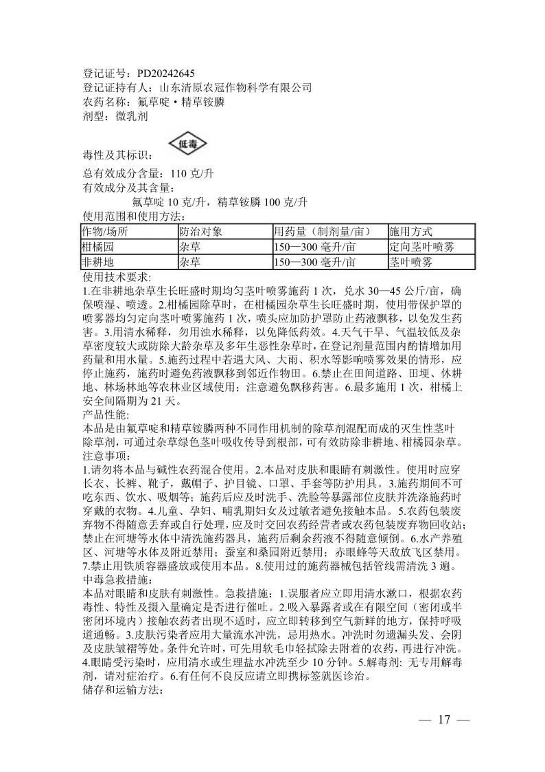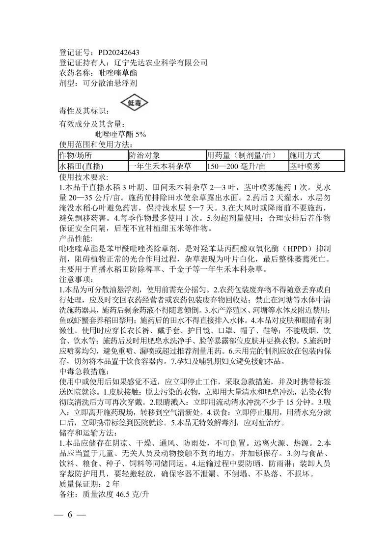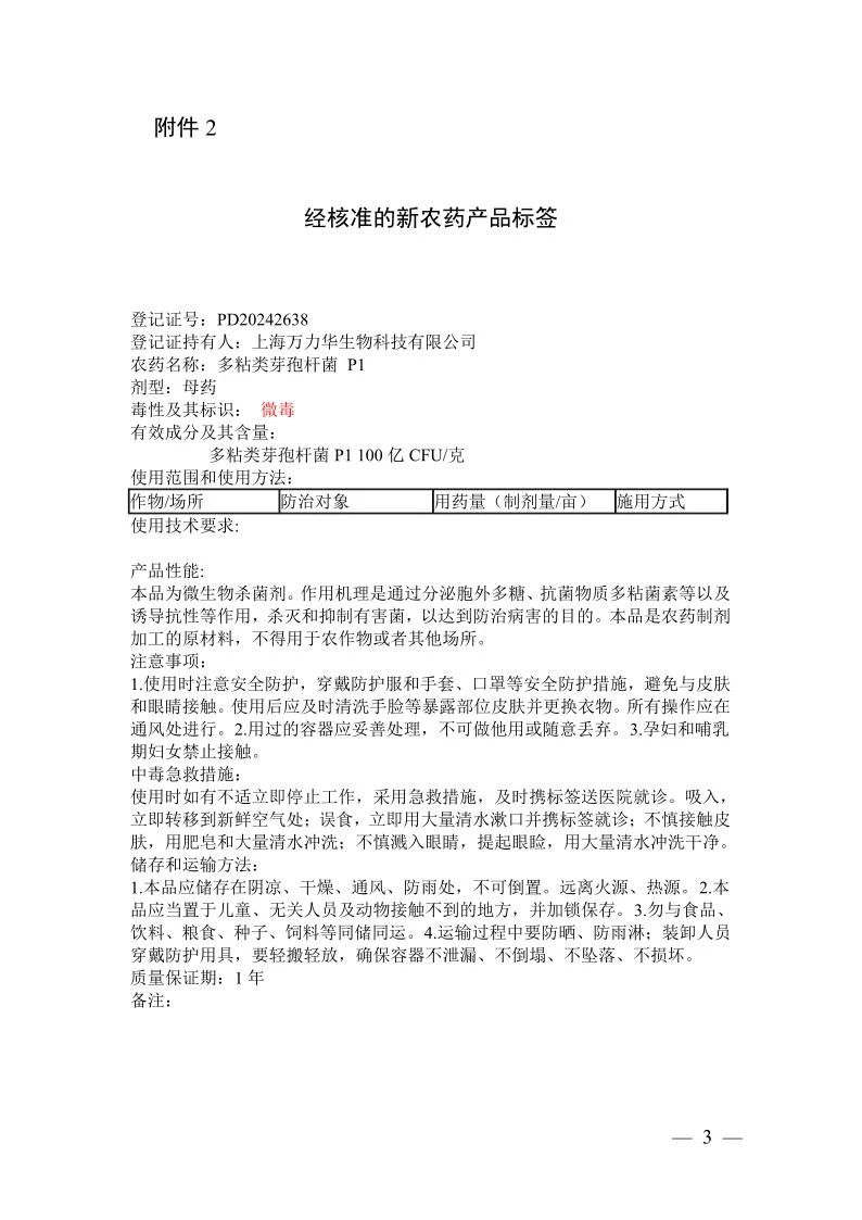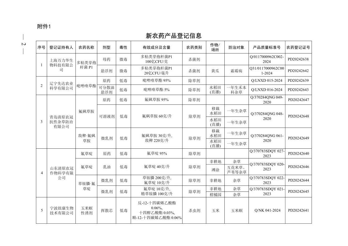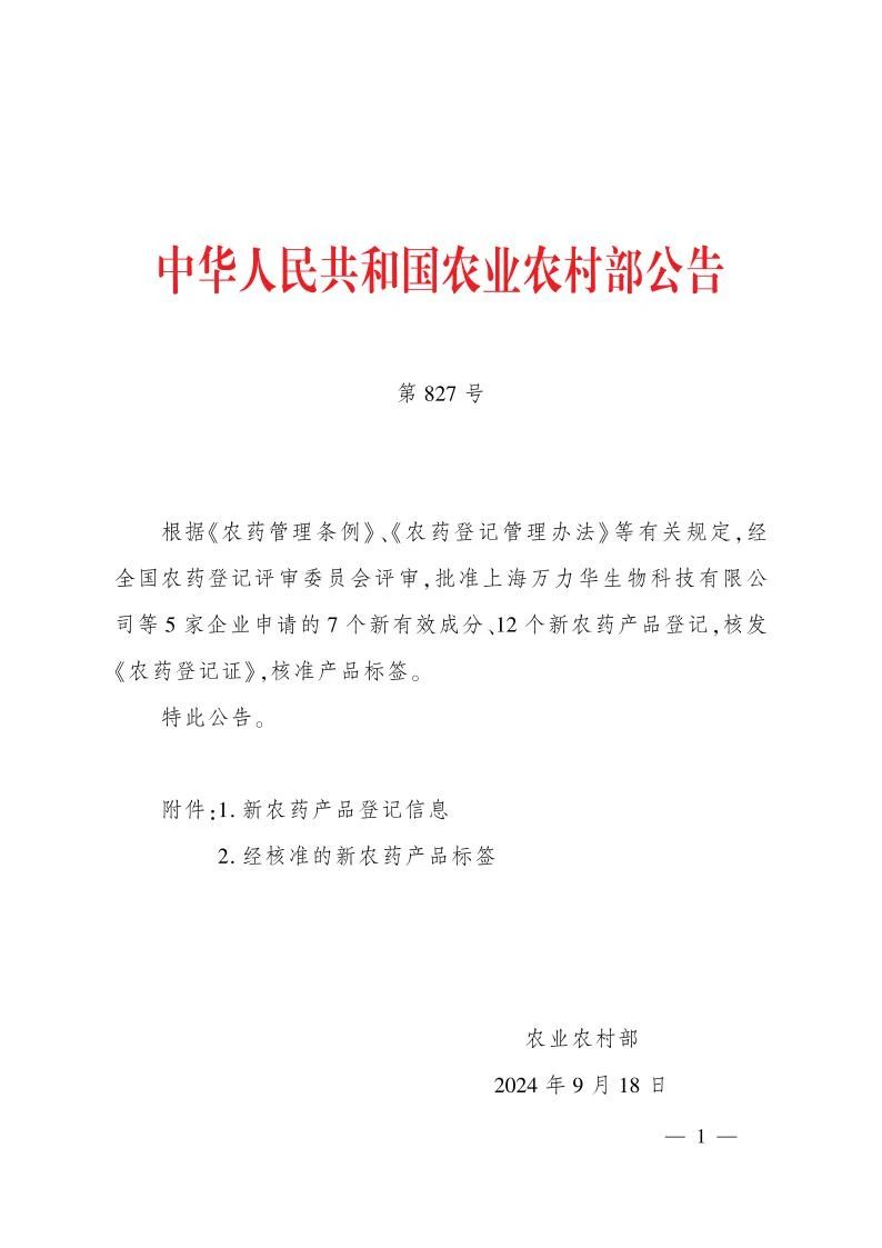 根據《農藥管理條例》《農藥登記管理辦法》等有關規定,經全國農藥登記評審委員會評審,批準上海萬力華生物科技有限公司等5家企業申請的7個新有效成分、12個新農藥產品登記,核發《農藥登記證》,核準產品標簽。