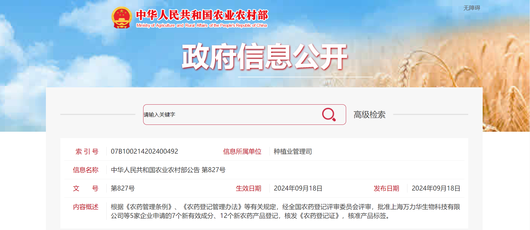 第827號公告:7個新有效成分、12個新農藥產品登記獲批