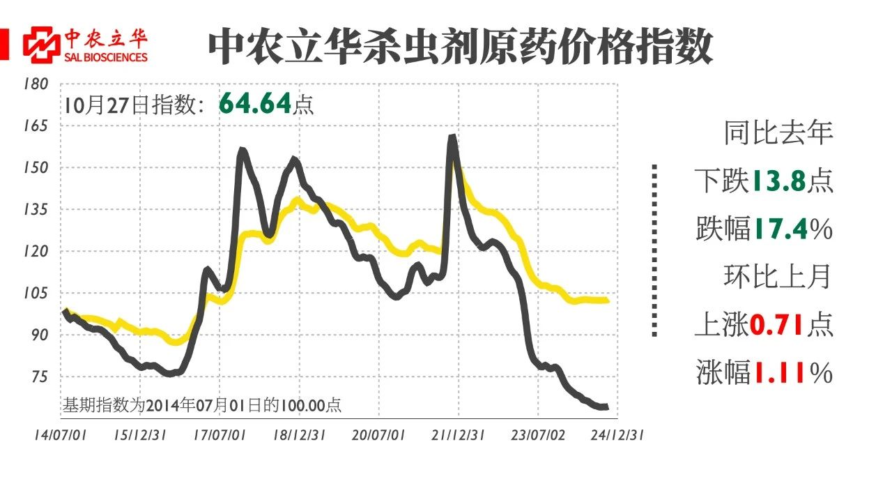 2024年10月27日,中農(nóng)立華殺蟲劑原藥價格指數(shù)報64.64點,同比去年下跌17.4%,環(huán)比上月上漲1.11%。殺蟲劑市場詢盤活躍度增加,部分產(chǎn)品供貨緊張,如阿維菌素,甲氨基阿維菌素苯甲酸鹽原藥供需失衡,期貨排單較多;其他品種交投活躍度上升,剛需疊加冬儲備貨,市場信心修復中。