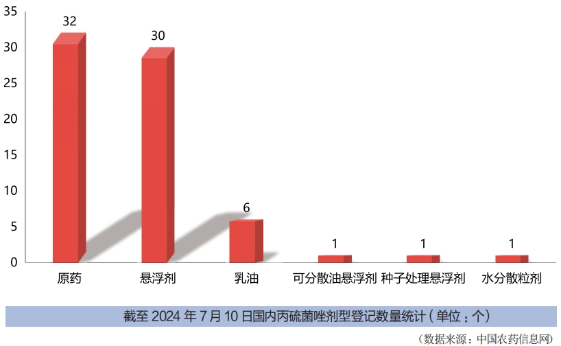 中國農藥信息網顯示,截至2024年7月10日,丙硫菌唑在國內登記產品達到69個,其中,單劑7個,原藥達到32個,混劑30個。制劑劑型主要有懸浮劑、可分散油懸浮劑、種子處理懸浮劑和專供出口的乳油制劑。目前,這些產品主要登記在小麥和花生兩種作物上,用于小麥赤霉病、白粉病和銹病以及花生白絹病的防治。