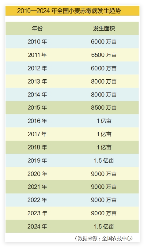 全國農技中心數據顯示,2024年全國小麥赤霉病總體依舊偏重流行,發生面積達到1.5億畝,需預防控制面積2.5億畝次以上。