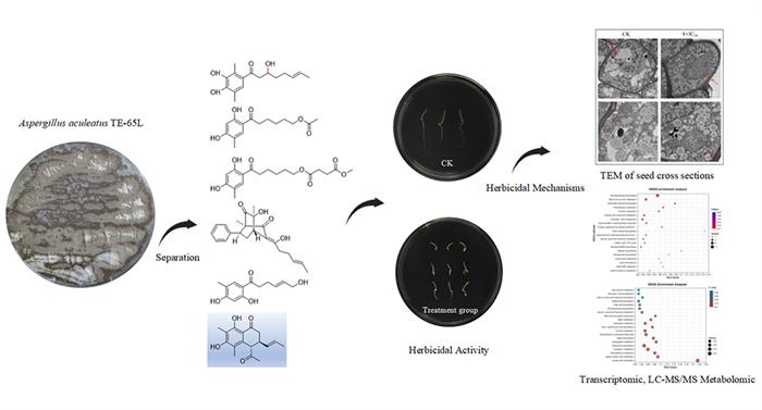 該團(tuán)隊(duì)篩選到一株對(duì)多種單子葉和雙子葉雜草具有顯著除草活性的棘孢曲霉TE-65L,從其發(fā)酵產(chǎn)物中獲得了5個(gè)新型山梨素類化合物。通過(guò)波譜分析光譜計(jì)算,確定了該類化合物的化學(xué)結(jié)構(gòu),并首次發(fā)現(xiàn)了其對(duì)雜草的除草活性,其中2個(gè)化合物能夠顯著抑制牛筋草胚芽和胚根的伸長(zhǎng),其活性均強(qiáng)于陽(yáng)性藥草甘膦。研究表明,該類化合物能夠誘導(dǎo)木質(zhì)素生物合成途徑,導(dǎo)致木質(zhì)素積累,并引起雜草種子細(xì)胞壁增厚,抑制雜草的生長(zhǎng)。該研究獲得了具有自主知識(shí)產(chǎn)權(quán)的天然除草劑分子模板,擴(kuò)展了天然產(chǎn)物除草劑的結(jié)構(gòu)類型,拓寬了山梨素類化合物的農(nóng)業(yè)應(yīng)用途徑。