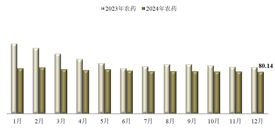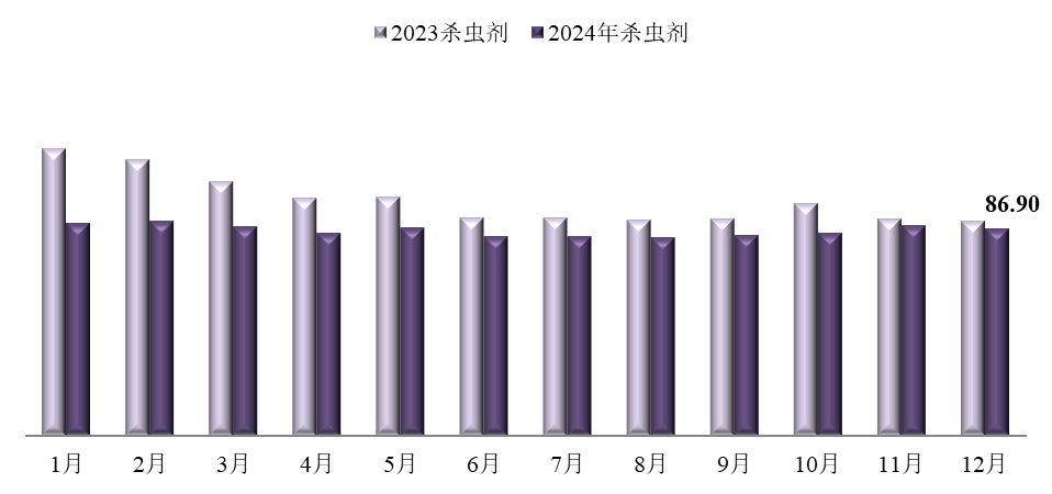 12月,殺蟲劑價格指數為86.90,環比下跌1.35%,同比下跌3.31%。監測在內的34種殺蟲劑產品中,加權平均成交價格環比上漲的21種,環比持平的1種,環比下跌的12種;加權平均成交價格同比上漲的10種,同比持平的2種,同比下跌的22種。