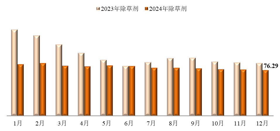 12月,除草劑價格指數為76.29,環比下跌0.94%,同比下跌14.03%。監測在內的36種除草劑產品中,加權平均成交價格環比上漲的16種,環比持平的1種,環比下跌的19種;加權平均成交價格同比上漲的4種,同比下跌的32種。