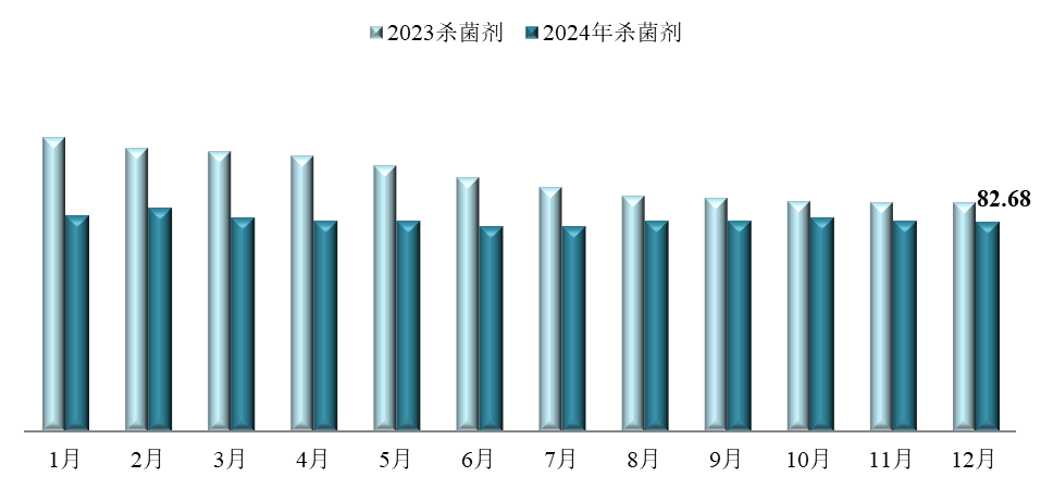 12月,殺菌劑價格指數為82.68,環比下跌0.47%,同比下跌8.35%。監測在內的30種殺菌劑產品中,加權平均成交價格環比上漲的14種,環比持平的2種,環比下跌的14種;加權平均成交價格同比上漲的7種,同比持平的1種,同比下跌的22種。