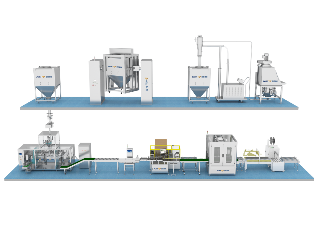 整個工藝流程從物料脫包、物料干燥、粉碎過篩、稱重配料、無塵投料、預混、轉運、自動包裝、檢測裝置、二維碼采集關聯、自動封箱打包、自動碼垛等設計,生產過程自動化程度高,降低企業用生產成本。