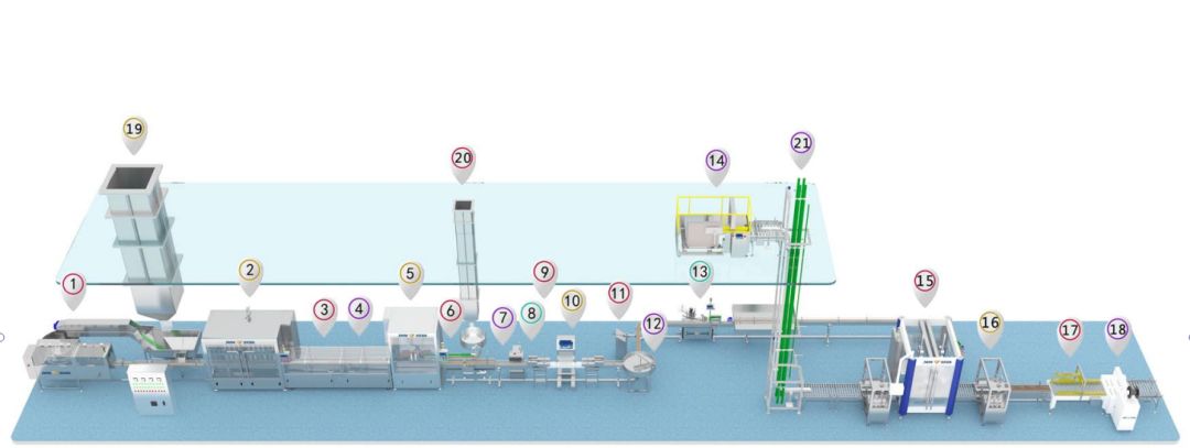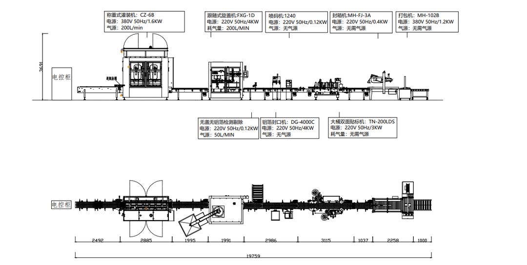 ④、工藝流程:一層人工放瓶--自動灌裝(鏡像)--自動上蓋--自動旋蓋(鏡像)--歪蓋、無 蓋、無鋁箔剔除--自動封口--自動噴碼--自動貼標(biāo)--人工裝箱--自動封箱打包